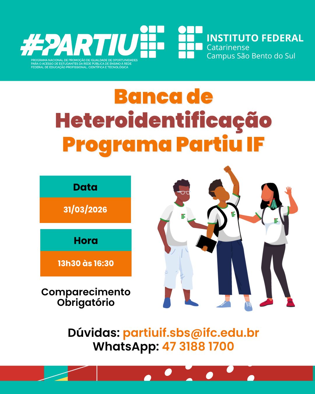 O Instituto Federal Catarinense (IFC) Campus São Bento do Sul convoca os candidatos inscritos no programa Partiu IF 2026 (Edital nº 23/2026) para a etapa presencial da Banca de Heteroidentificação. O procedimento é obrigatório para os estudantes que concorrem às vagas reservadas e visa validar a autodeclaração étnico-racial.